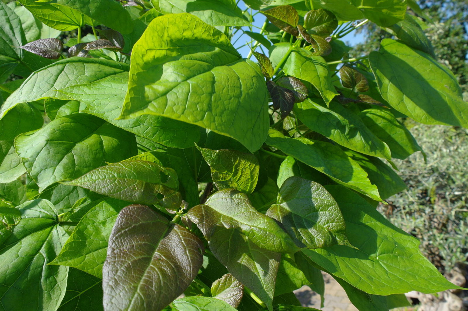 Het is een boom met een hoge sierwaarde vanwege het grote, opvallende blad en de witte trompetvormige bloemen. De bladeren lopen paars uit, kleuren daarna goudgeel en zijn in de zomer groengeel. Uit de bloemen ontstaan decoratieve peulvruchten die tot ver in de winter aan de boom blijven.