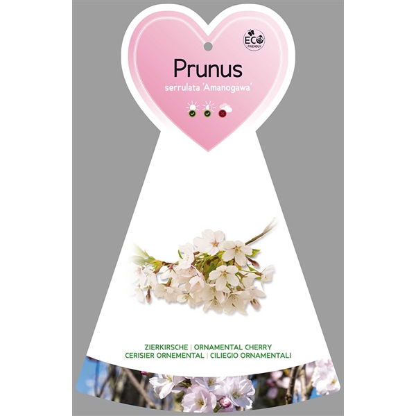 De Prunus Serrulata Amangawa is een Japanse sierkers. In april-mei zit hij vol met roze gevulde bloemen die in trossen aan de boom hangen. Na de bloei komen er smalle langwerpige donker groene bladeren die in de herfst verkleuren naar rood oranje. Hij heeft een smal opgaande groeiwijze en zal uiteindelijk ongeveer 5 meter hoog worden. snoeien is niet nodig, maar mag wel, doe dit dan na de bloei. De standplaats is in de zon.