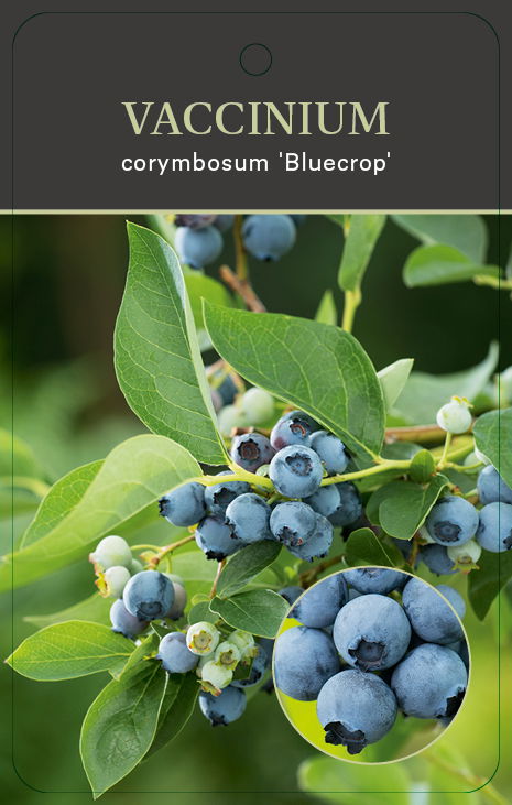 Bluecrop is een soort die iets beter bestand is tegen drogere grond. Vanaf juli tot in augustus kunt u de grote stevige licht blauwe bessen oogsten, ze zijn zacht zuur van smaak.