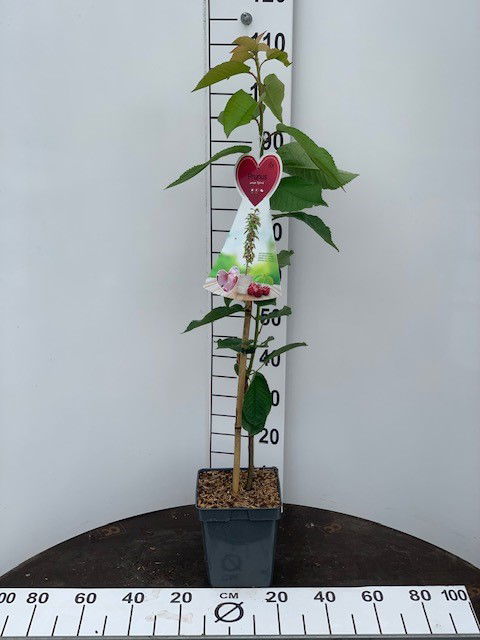 Deze zuilvormige kers is een mooie plant voor een kleine tuin, terras of balkon. Hij bloeit in april-mei met kleine wit-roze bloemen die bijen en vlinders lokken. In juli zijn de donkerrode zoete kersen te plukken.